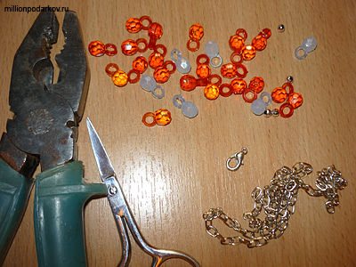 Для браслета нам потребуется цепочка, бусины с широким отверстием, маникюрные ножницы, плоскогубцы, застежка крючок.