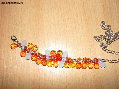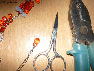 С помощью маникюрных ножниц разжимаем крайнее звено цепочки. Надеваем застежку. Зажимаем звено с помощью плоскогубцев.