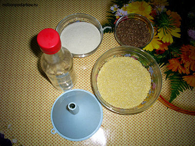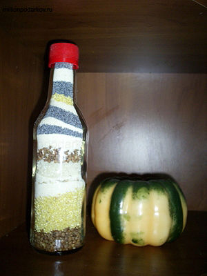 С помощью лейки насыпаем крупы в бутылочку. Делайте это в художественном порядке. Отлично смотрятся крупы контрастных цветов, а также манка, выложенная слоями с маком. В нашем случае мы использовали мак, манку, гречку, пшено, рис и овсяные хлопья. Получился вот такой замечательный сувенир, который стал достойным украшением кухни. Такие поделки из бутылок можно делать вместе с детьми. Доверьте им столь увлекательный процесс засыпания круп – восторгу их не будет предела.