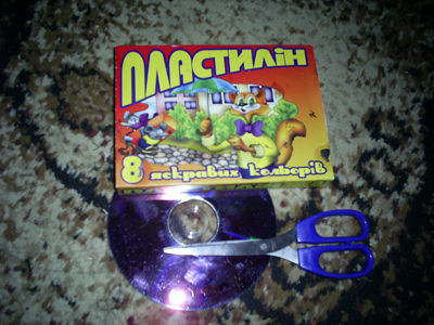 Для изготовления поделки подготовьте такие материалы, как цветной картон, пластилин, ножницы, диск, клей ПВА, акриловые краски.