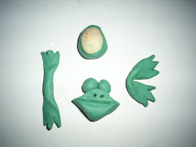Из пластилина делаем детали лягушки. У нас получилась голова с глазами, туловище, две пары лапок.