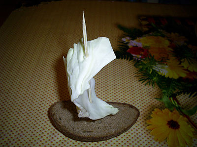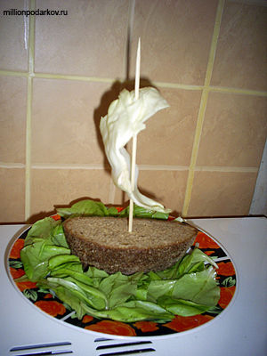 Берем ломоть хлеба и втыкаем в него шпажку. Если она слишком длинная, ее следует укоротить. Теперь берем подходящий лист капусты и надеваем на шпажку. Получается парус.