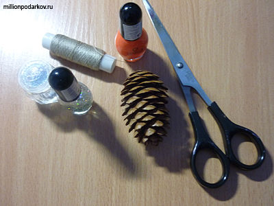 Вам потребуется еловая шишка, ножницы, нитки, лак для ногтей цветной и прозрачный, блёстки, ватная палочка, подстилка.