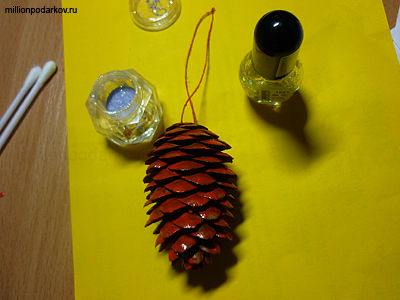 Шишку покройте лаком для ногтей. Цвет выбирите сами (я использовала оранжевый лак). Лак хорош тем, что он быстро сохнет и полностью покрывает поверхность изделия.