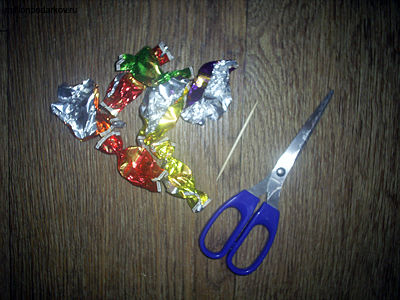 Для изготовления елочки подготовьте разнообразные конфетные фантики, зубочистку, на которую мы будем их нанизывать и ножницы для разрезания бумажек.