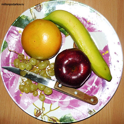 Для этой фруктовой поделки вам потребуется один банан, одно яблоко, немного винограда, грейпфрут. Так же приготовьте большую плоскую тарелку, нож и разделочную доску.