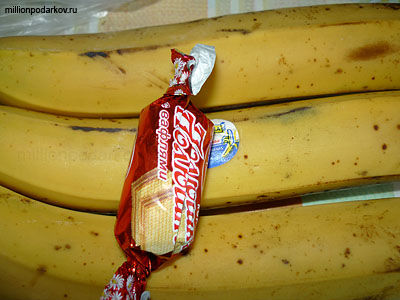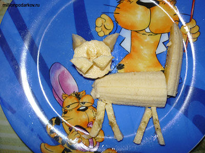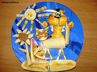 Разрезаем конфетку и делаем из неё усики, носик и глазки. Дополняем картинку фрагментами из банана и конфеты. Поделка из фруктов "Кот из банана" готова!