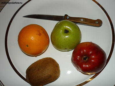Для того, чтобы сделать такую поделку вам потребуется 2 яблока, одно красное, другое зеленое, киви, апельсин, нож, разделочная доска и большая тарелка.