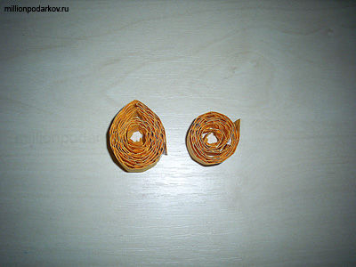 Теперь две полоски сворачиваем в кружок. Клеем ПВА скрепляем конец полоски, чтобы деталь не распустилась. Конец одного из кружка заостряем. У нас получилось тело и голова цыпленка.