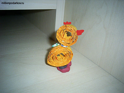 Теперь склеиваем две детали между собой. Из картона розового цвета сделаем гребешок и клювик и приклеим их к голове цыпленка. Теперь нам осталось сделать лапки из пластилина. Вот что у нас получилось в итоге. Такие поделки из гофрированного картона могут стать отличным украшением к Новому году или подарком на 8 марта, именины.