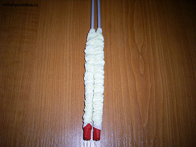 Ставим спицы вертикально и аккуратно сжимаем полоски, начиная с их конца и постепенно поднимаясь к верху. Вот такая двойная трубочка из гофрированной бумаги у нас получилась в итоге.