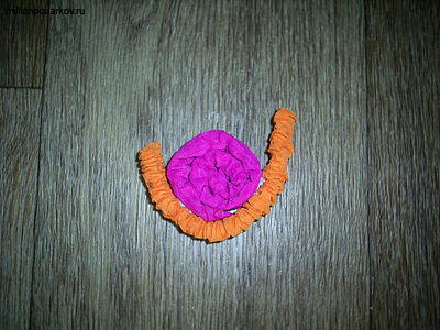 Розовую полоску скатываем по спирали, подклеиваем, приклеиваем к оранжевой полоске. Лишнее отрезаем.