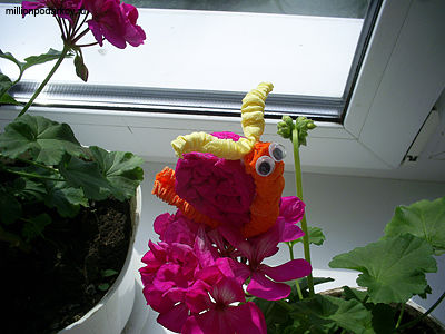 Приклеиваем термопистолетом рожки из одинарной гофротрубочки и глазки. Вот и готова наша замечательная улиточка. Такие поделки из гофрированной бумаги обязательно понравятся малышам.
