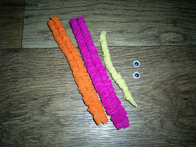 Для улитки нам понадобились две двойные трубочки оранжевого и розового цвета, одинарная трубочка бежевого цвета и глазки.
