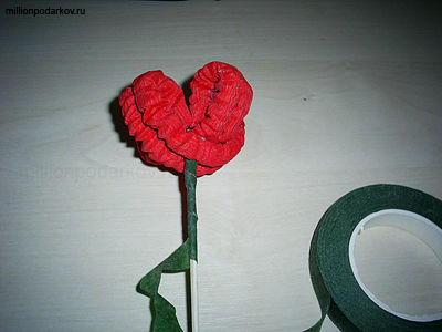 Прокалываем бутон шампуром, обматываем его флористической лентой. Получается стебель.