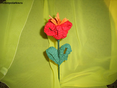 Делаем сердцевину, разрезав полоску оранжевой гофрированной бумаги на полоски и приклеив посередине цветка. Делаем листочки, подклеив два конца гофротрубочки в середину и проколов сквозь нее шампур. Вот такой замечательный цветок у нас получился в итоге. Такие поделки из гофробумаги можно делать всей семьей, чтобы затем подарить их друзьям и близким.