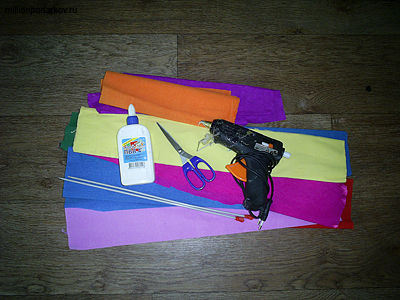 Для того чтобы сделать цветок, Вам понадобятся такие материалы, как гофрированная бумага, клей ПВА, ножницы, клеящий термопистолет, спицы, бамбуковый шампура, зеленая флористическая лента.