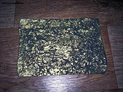 Лист бумаги мнем и наклеиваем на картонку. Для этого можно использовать клей ПВА или пальчиковый сухой клей. Ждем, пока бумага высохнет. Берем золотую акриловую краску и губкой наносим ее на жатую бумагу. Наносите краску легко, чтобы она окрашивала лишь выступающие части.