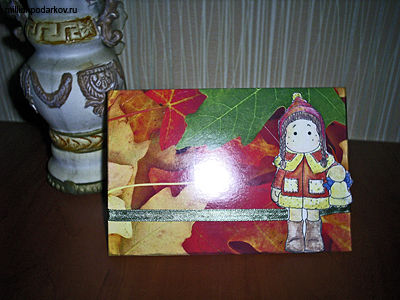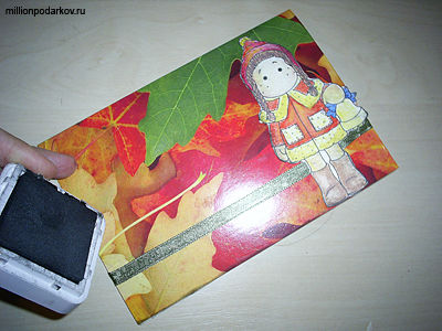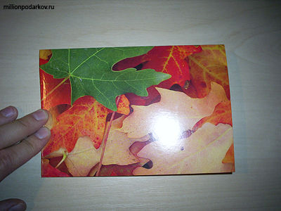 Отрежьте от картона с рисунком осенних листьев половину и сложите ее пополам.