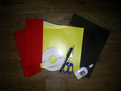 Для того чтобы сделать солнышко, нам пригодятся такие материалы, как испорченный компакт-диск, цветной картон, гофрированная бумага, черный маркер, ножницы, клей ПВА, магнит-самоклейка, спицы, клеящий термопистолет и белая бумага.