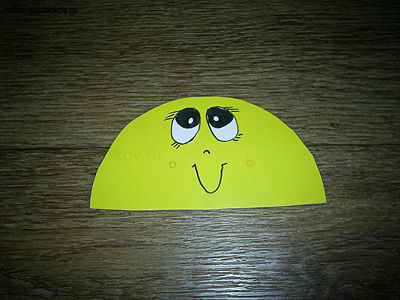 Отрезаем от диска половину. По ней вырезаем из желтого картона деталь и приклеиваем к диску клеем ПВА. На белой бумаге рисуем маркером глазки, вырезаем, приклеиваем к личику. Рисуем ротик, носик, реснички.