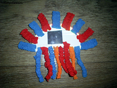 Сегодня будем делать поделки из компакт-дисков. Кроме самого диска нам также понадобится картон и гофрированная бумага. А делать мы будем магнит на холодильник в виде солнышка.
