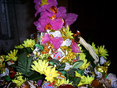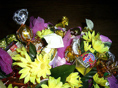 Делаем из картона конус, наклеиваем на него с помощью горячего силиконового пистолета конфеты и цветы, размещаем в букете.