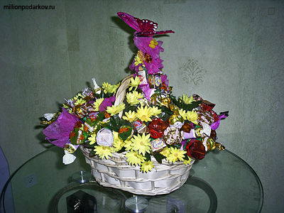Поделка из конфет «Букет из конфет 'Корзинка с бабочкой'»