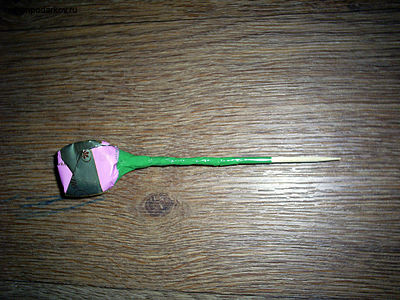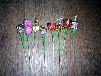 Итак, приступаем к изготовлению самого «цветка». Берем конфету и шпажку. Если палочка длинная, то ее можно разрезать пополам. Теперь на тупой конец шпажки приклеиваем двухсторонний скотч и прикрепляем ее к конфете, обкручивая фантик вокруг палочки. Затем обматываем «цветок» по верху скотчем. Вот что должно получиться в итоге.