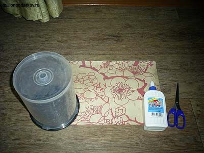 Для изготовления поделки подготовьте бокс из-под дисков, декоративную бумагу, клей ПВА и ножницы.