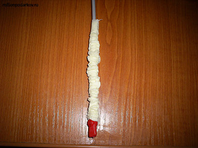 Накручиваем на спицу полоску шириной около 7 см и произвольной длины. Конец промазываем клеем ПВА и подклеиваем. Когда клей высохнет, ставим спицу вертикально и сжимаем трубочку, начиная снизу и к верху. Снимаем со спицы.