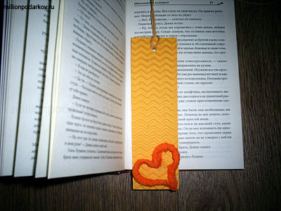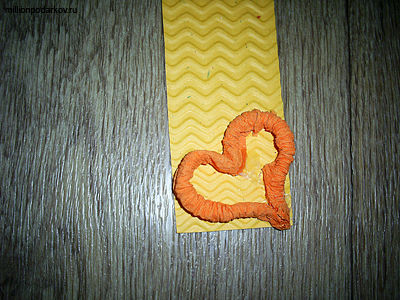 Из гофрированного картона вырезаем полоску. Из гофротрубочки делаем сердечко и приклеиваем к закладке с помощью термопистолета.