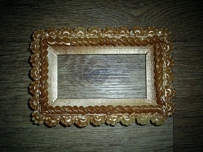 Теперь осталось покрыть ее бронзовой аэрозольной краской и поставить фотографию или картинку. Вот что у нас получается в итоге. Теперь с первого взгляда и не скажешь, из чего изготовлена рамочка. Таким же способом макаронами можно украшать и различные другие изделия. Так что теперь, когда ваша душа жаждет заниматься творчеством, а никаких специальных материалов под рукой нет, вы можете делать поделки из макарон. И даже если у вас нет аэрозольной краски, то можете попробовать покрасить рамочку акриловыми, гуашевыми или даже акварельными красками, смешав их с клеем ПВА.