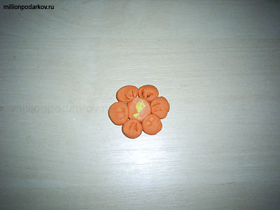 Сначала слепим из оранжевого или желтого пластилина цветочек. Острым концом стека сделайте на лепестках прожилки.
