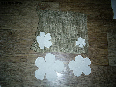 Из мешковины вырезаем прямоугольник. Из бязи выкраиваем цветы разных размеров.