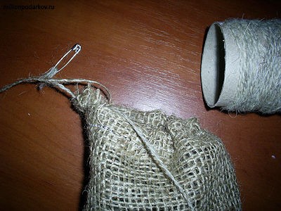 Выворачиваем мешочек и вставляем шерстяную нитку, пользуясь английской булавкой.