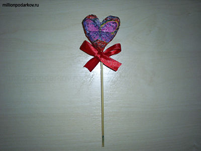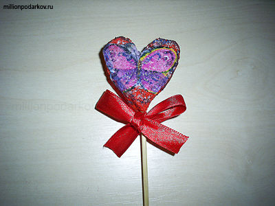 Теперь возьмите акриловые краски и разноцветную салфетку и сделайте декор сердечка. Для этого мы сначала покрасили поделку в красный цвет, затем вырезали из салфетки бабочку и приклеили ее к сердечку клеем ПВА. Обозначили контуры картинки черной краской. Потом мы взяли бамбуковую шпажку, и надели на ее сердце. Осталось лишь сделать из красной атласной ленточки бантик.