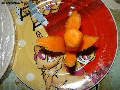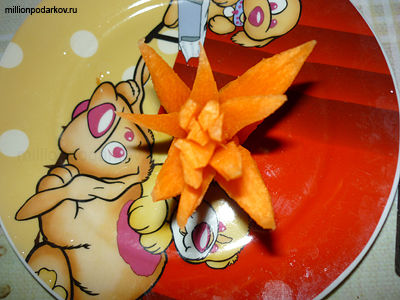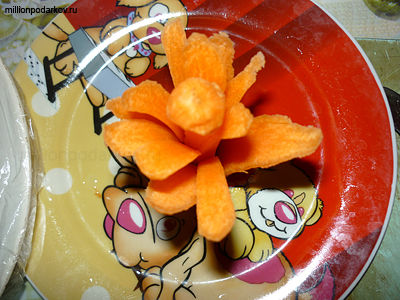 Оставшуюся часть морковки режем ножом крест накрест. Затем с помощью ножниц придаем более правильную форму для лепестков. Всё, поделка готова!