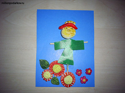 Теперь раскрасьте поделки и сделайте из них на картоне красивую композицию. Мы соорудили цветочную поляну с симпатичным пугалом. Голова пугала вылеплена из соленого теста, туловище и руки сделаны из бамбукового шампура, а одежда - из кусочка зеленой атласной ленты. Такую картинку можно впоследствии оформить в рамочку и повесить на стену.