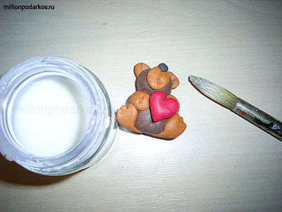 Добавляем лапки, мордочку и ушки из бледно-коричневого пластилина. Делаем красное сердечко и черный носик. Стеком формируем глазки и ротик. Варим 15 минут или запекаем в духовке.