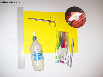 Из бумаги вырежьте небольшой круг, нарисуйте на нем личико. Приклейте в центр диска. Такие поделки из ненужных дисков хорошо вешать у окна или лампы - они будут переливаться и сверкать.