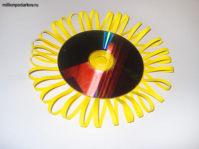Намажьте основания полосок с обратной стороны клеем. и начинаем приклеивать. Свободный конец каждого лучика клеим к основанию соседнего лучика. По размерам диска вырежьте круг из бумаги и наклейте на изнанку, где крепились наши лучики, теперь наша работа выглядит аккуратнее.