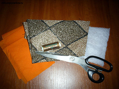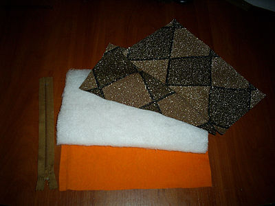 Сегодня мы будем делать косметичку. Для того чтобы сшить ее, нам понадобился оранжевый ситец, кримплен с люрексом, синтепон, молния, иголка, нитки и ножницы. Вместо иголки с нитками лучше воспользоваться швейной машинкой.