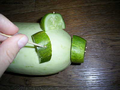 Из огурца отрезаем два кружка, один из них разрезаем пополам. Крепим половинки сверху кабачка, а целый кружок – спереди. Для крепежа применяем зубочистки. Торчащие концы зубочисток срезаем ножом или ножницами.