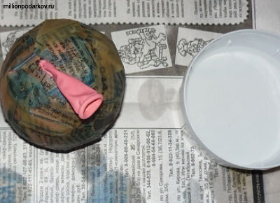 Клей ПВА смешайте с водой в пропорции 1/3. Нарвите газету на маленькие кусочки, затем опустите кусочки газеты в раствор клея с водой. Затем на воздушный шарик мы будем накладывать мокрую пропитанную водой и клеем газету.