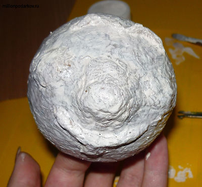 После высыхания головы воздушный шарик аккуратно прокалываем и вынимаем. Затем голову покрываем белой гуашью на несколько слоёв.