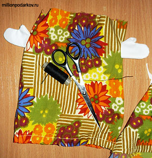 Вырезаем из ткани прямоугольник и сшиваем его. Затем шьем рукавички, такие, чтобы в них могли легко поместится пальцы руки. Пришиваем рукавички к нашему прямоугольнику.