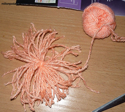 Делаем нашему будущему клоуну волосы из цветных шерстяных ниток. Для этого просто нарезаем нитки по 6-8см и связываем их в середине.