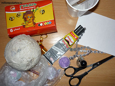 Когда шарик высох, готовим материалы для дальнейшего декорирования изделия. Приготовьте гуашь, кисточку и воду в стаканчике, так же вам потребуется листок белой бумаги и клей "Момент". Приготовьте пайетки, блестки и прозрачный лак для ногтей. Не забудьте о веревочке на которую будет подвешен шарик.Я использовала ленту для упаковки, но можно взять и толстую нитку.