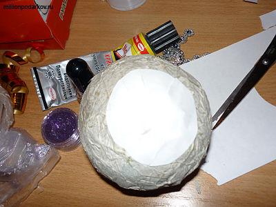 Для начала вам необходимо сделать основу из папье-маше. Для этого надутый воздушный шарик обклейте маленькими кусочками газеты намоченной в растворе клея ПВА и воды, а затем даём высохнуть сутки.